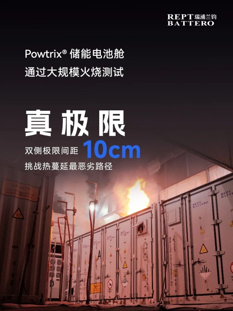 在此次测试中,Powtrix®储能电池舱面对底部点火触发、双边间距不足10cm、1000℃喷射火焰炙烤以及移除消防药剂储罐等一系列挑战,在多重“不利”条件下持续燃烧约14小时,但储能电池舱依然表现出卓越的安全性,有效抵御了极端危害的冲击,展现出其在安全性方面的强大实力和可靠性能,为储能系统产品的大规模应用提供了坚实保障。